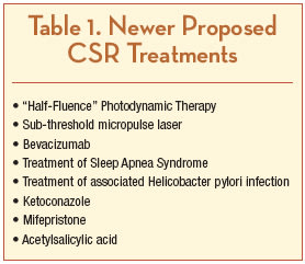 • Photodynamic Therapy: “Standard” and “Half-fluence” Doses. Photodynamic therapy to treat CSR continues to be studied in both the acute and chronic presentations. PDT may allow for cessation of RPE leaks in CSR by causing choriocapillaris hypoperfusion in the near term, followed by choroidal vascular remodeling, preventing recurrence.