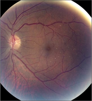 Figure 2. White, crystalline intravascular talc deposits throughout the macula, left eye.