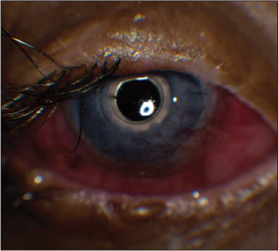 Figure 2. In this postkeratoprosthesis patient with extensive conjunctival scarring due to a chemical burn, filtration surgery was not possible and endocylophotoablation was performed through a pars plana approach.
