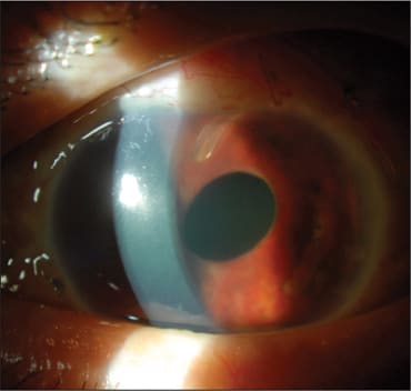 Descemet's stripping automated endothelial keratoplasty (DSAEK) is becoming increasingly common and, in most cases of DSAEK in patients with anterior-segment tubes, tube repositioning will be indicated, usually into the vitreous cavity. Finally, in glaucoma with severe conjunctival disease where bleb formation is impossible, endoscopic cyclophotocoagulation can be performed through a PPV or anterior approach. For example, in postkeratoprosthesis patients (Figure 2), the anterior chamber is essentially nonexistent, and we prefer that this intervention be performed through the pars plana.