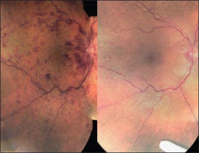 Figure 2. Nonischemic CRVO with macular edema and significant hemorrhagic component, right eye, before (left), and after (right) six consecutive monthly bevacizumab intravitreal injections and dexamethasone intravitreal implant. Note disc edema with Patton lines on the left; note resolution of disc and macular edema on the right, with decompression of veins and dexamethasone implant inferiorly.
