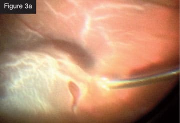 Membrane removal with vitrector. CASE 3: Total rhegmatogenous retinal detachment. I frequently combine scleral buckling with small-gauge vitrectomy. In a recent case of total rhegmatogenous retinal detachment (Figures 3a and 3b), I first did the scleral buckle and then removed the vitreous from the periphery with minimal traction on the retina. The creation of iatrogenic breaks is markedly reduced with this technology. I injected perfluorocarbon liquid and aspirated subretinal fluid. I like to aspirate often with the vitrectomy probe through the break. Next, I applied laser photocoagulation to the break. With the flexible tip laser probe, I find I can treat that entire area in an elegant, quick way, even in phakic