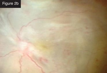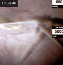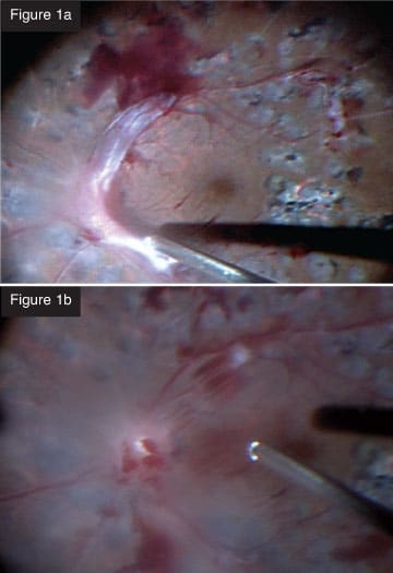 | CASE 1: Combined tractional rhegmatogenous retinal detachment in a diabetic patient. Using the 25+ for a tractional retinal detachment, I can remove thick blood clots efficiently, something that was not possible with the previous vitrectomy systems. The probe is so small, it can get under the membranes so you can dissect them. You can shave them from the surface of the retina in much the same way you would use vertical scissors. You can almost peel them from blood vessels. In a recent case (Figures 1a and 1b), I created a space to lift the fibrovascular membrane, which allowed me to remove it with the cutter. I was able to get very close to the retina with almost no movement, which was unthinkable with our previous technology. After removing the tissue, which was quite thick, I applied diathermy to the breaks, performed fluid-air exchange and applied photocoagulation. A nice feature of the laser is that you can control the intensity of the burns with the foot pedal. This type of case can be done efficiently with minimal complications. The IOP control prevents bleeding from a drop in IOP during instrument exchanges. In the past, we would have had to perform a complicated procedure with a multitude of different instruments.