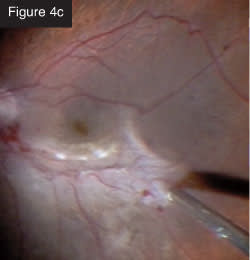 Final view. CASE 5: Severe PVR with subretinal membranes. In this case, the eye was filled with silicone oil. The eye already had several surgeries, but the conjunctiva looked good. I removed the oil (Figure 5a) and then went under the retina to remove large sheets of subretinal membrane that had collected all the way around (Figures 5b and 5c). While doing this case, I was impressed with the lighting on the CONSTELLATION® System and how well I could visualize tissue at all times. I performed a fluid-air exchange and aspirated with the same probe through the retinotomies. After applying laser to the breaks, I injected silicone oil. I performed all of these maneuvers in a smooth, seamless, efficient manner with minimal exchange of instruments and with total IOP control throughout. These few cases represent the many complex pathologies that can be treated using the CONSTELLATION® Vision System.
