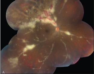 A 38-year-old, African-American, HIV-positive female (CD4 = 6) presented in October 2009, complaining of blurry vision in her right eye for several days. Her initial visual acuity was 20/70 in the right eye and 20/20 in the left eye. The posterior-segment exam (Figure 1) demonstrated peripheral retinal necrosis and hemorrhage consistent with CMV retinitis of the right eye. The patient was admitted for treatment with intravenous ganciclovir (5 mg/kg IV bid) and begun on HAART. However, the patient left against medical advice (AMA) after seven days of treatment.