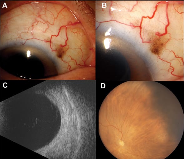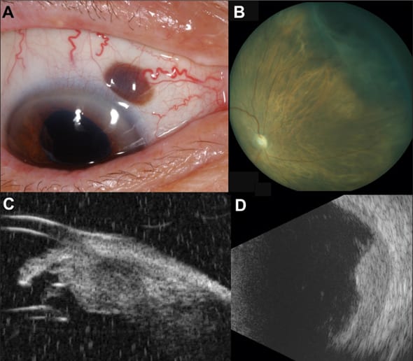 Figure 1. Extraocular extension of ciliary body melanoma before treatment: (A) EOE is noted superonasally, with an associated sentinel vessel. (B) Panoret photograph depicting the ciliary body melanoma superonasally. (C) Ultrasound biomicroscopy demonstrating the ciliary body mass with a small area of scleral thickening corresponding to the EOE. (D) B-scan ultrasound with a dome-shaped mass corresponding to the melanoma.