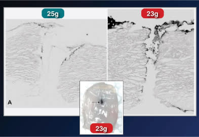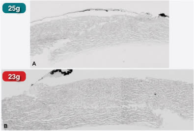 The next part of the experiment involved placing India ink on the wounds to determine where ink particles reach in differently shaped incisions. In a straight incision (Figure 3), even with 25-g cannulas, ink particles are found both in the wound and inside the eye. Conversely, there were no ink particles inside the eye when using an angled incision (Figure 4). As the size of ink particles is comparable to that of bacteria, this is an important finding, and illustrates the importance of an angled incision.