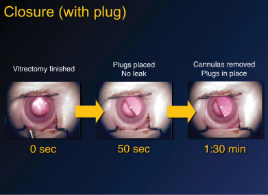 An important point to remember, however, is that, when the instruments are withdrawn, there will be very low IOP holding the wound closed since the other cannula is open, so it is vital that the light pipe be inserted into the other side to pressurize the eye and allow the wound to close.