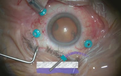 To achieve this, the surgeon should displace the conjunctiva before inserting the trocar. In addition, to make the chord length in the sclera as long as possible, I like to flatten the sclera with a broad stabilizing device on insertion of the trocar (Figures 1 and 2). This can be done with a cotton swab or with inserters. Finally, make the angle as oblique as possible to the sclera. The result is a wound that is not even visible, compared to the obvious wound gap and leakage found with straight incisions.