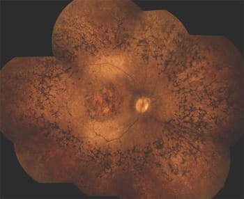 Figure 9. This fundus image of a patient with mutations in RDH12 taken at nine years of age shows optic disc pallor and attenuation of the vessels. There is a maculopathy and bone-spicule like pigmentation outside of the arcades. Note the peripapillary sparing of the RPE.