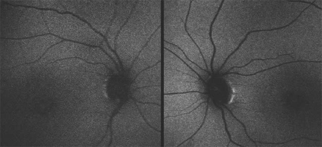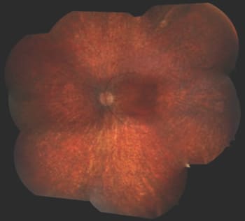 The fundus appears normal at birth, but progressive abnormalities can develop. These abnormalities include RPE atrophy, arteriolar narrowing, pigmentary retinal changes, maculopathy and retinal and foveal thinning. Peripapillary hypopigmentation develops surrounding and inferior to the optic nerve.12 Relative preservation of the retinal layers can be seen on OCT, but the retina seems to grow thinner with age, ultimately resulting in loss of the photoreceptor layer.