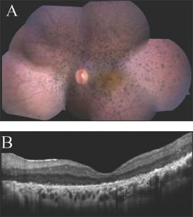 Figure 4. (A) At the age of 18 years the left fundus of a patient with CRB1 mutations shows a maculopathy and some attenuation of the arterioles. The type of pigmentation is nummular rather than bone-spicule-like. (B) The OCT of the macular area shows a normal foveal depression with an increased retinal thickness surrounding the fovea. Punctate photoreceptor remnants, absence of the outer limiting membrane, and thickened lamination of the inner retina are apparent.