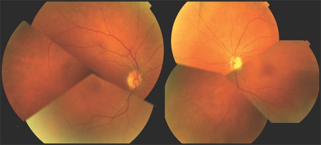Figure 6. Fundus photographs of a 25-year-old patient with mutations in GUCY2D show normal optic discs, mild attenuation of the arterioles and normal maculas. There is some minor RPE mottling in the far periphery.