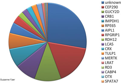Alongside the obvious clinical heterogeneity, LCA is also genetically heterogeneous. The mode of inheritance is generally considered to be autosomal recessive, although rare dominant forms of LCA have been reported. To date, mutations in 18 different genes have been found to cause LCA (see http://www.sph.uth.tmc.edu/Retnet/sum-dis.htm#B-diseases). The distribution of the genes underlying LCA is heavily dependent upon the population examined. The spread of genes involved in Western countries is shown in Figure 1.