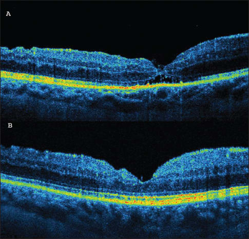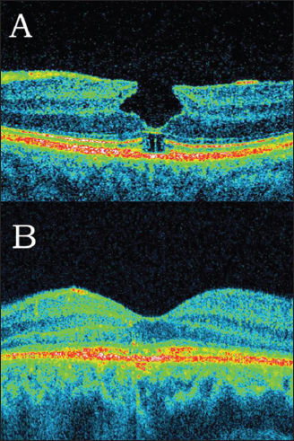 Figure 4A. Lamellar macular hole with epiretinal membrane and defect of the junction between inner and outer segments of photoreceptors in the same eye surgery. (B) Restoration of the IS/OS line may be observed.
