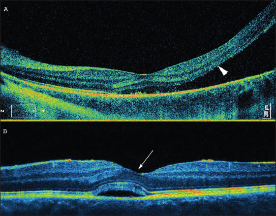Figure 2. Retinal detachment near the fovea. (A, top) The arrow shows the presumed IS/OS line, which is not visible central serous chorioretinopathy. (B, bottom) The arrow shows Henle's fibers.