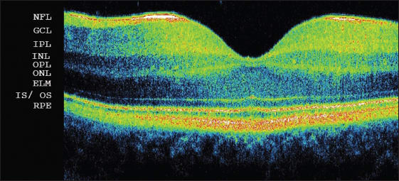 Figure 1. Spectral-domain optical coherence tomography of a healthy fovea: NFL: nerve fiber layer; GCL: ganglion cell layer; IPL: inner plexiform layer; INL: inner nuclear layer; OPL: outer plexiform layer; ONL: outer nuclear layer; ELM: external limiting membrane; IS/OS: junction between inner and outer segments of photoreceptors; RPE: retinal pigment epithelium.