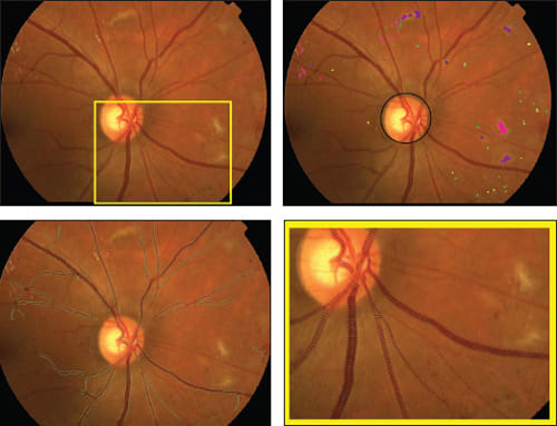 Figure 1. Fundus imaging biomarkers from a subject with diabetes and diabetic retinopathy. Input fundus color image (top left); lesion load metrics for hemorrhages (greenish), microaneurysms (yellowish), exudates (pinkish), retinal infarcts (purplish), the color shades indicate the confidence in the lesion type, and structural analysis of the disc location (top right); vessel analysis with green vessel boundaries (bottom left); detail of vessel analysis with local vessel widths visualized (bottom right).