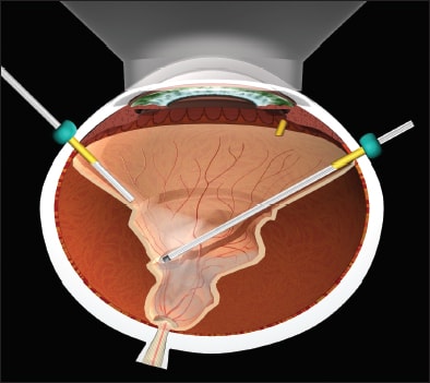 The author uses a 25-g sutureless approach for all vitrectomies, including rhegmatogenous retinal detachments, posterior vitreous retinopathy, giant breaks and diabetic traction retinal detachments. Just as today's patients expect emmetropia without strabismus or ptosis, as discussed above, they expect a painless procedure and a noninflamed eye. A noninflamed, pain-free eye is not achievable with 20-g sutured wounds or vit-buckles. Contrary to what some surgeons believe, 25-g vitrectomy fluidics are preferable to 23-g or 20-g fluidics for all RD cases, simple to complex, because port-based flow limiting due to a smaller lumen reduces pulsatile vitreoretinal traction.
