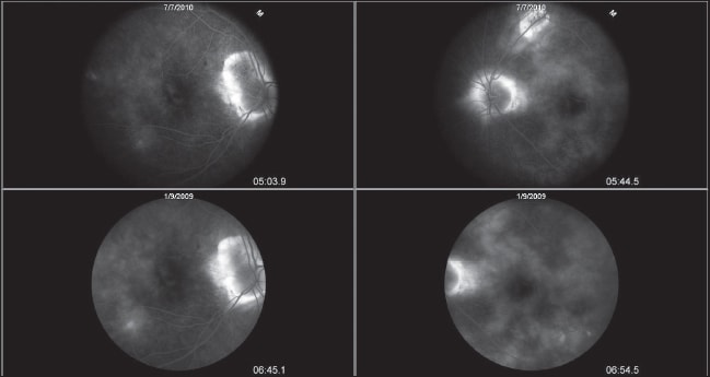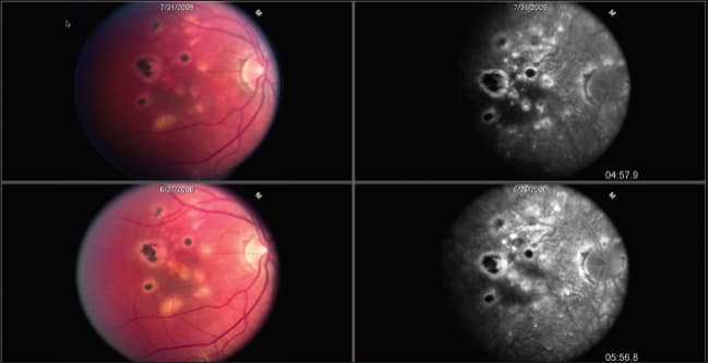 Figures 1-4. Right and left eyes of a patient implanted with Retisert to control multifocal choroiditis with panuveitis. Note the reduced leakage on fluorescein angiography.