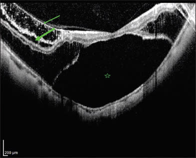 Figure 2. SD-OCT image of a 60-year-old woman with high myopia and posterior staphyloma demonstrating typical MF (large arrow), premacular structure (small arrow), and foveal detachment (star).