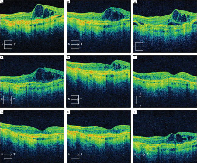 Case 4. A 76-year-old male patient who suffered from AMD and received over 40 monthly injections of ranibizumab or bevacizumab. Shown are OCTs at month 1 (Figure A), month 12 (Figure B), month 36 (Figure C) and month 40 (Figure D). Two weeks following the 40th ranibizumab injection (Figure E), Ozurdex was injected. Figures F-H show the OCTs from months 41 through 43. The OCT was dry after month 43; however, fluid then re-accumulated (Figure I).