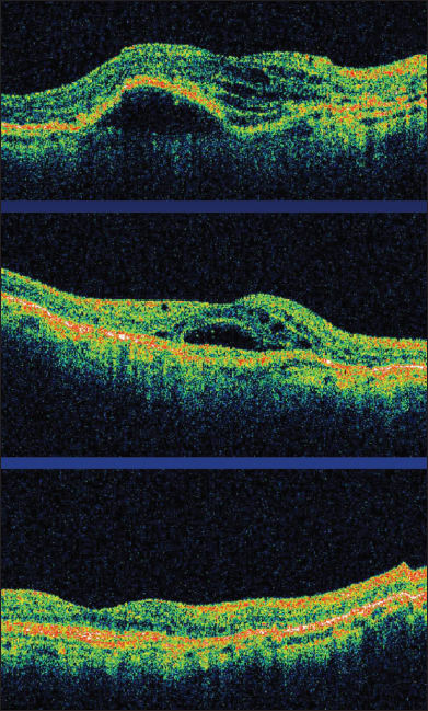 Figure 5. In the same patient, the macula dried (top) when the interval was reduced to eight weeks, and was then in creased to 10 weeks (center) and 12 weeks (bottom).