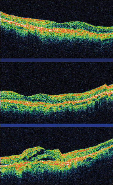 Figure 3. From baseline (top), the patient improved to 282 µm retinal thickness (center). Four weeks after that (bottom), the macula was dry.