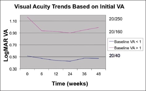 Figure 8. Depending on baseline visual acuity, mean final VA was either >20/160 or <20/40.