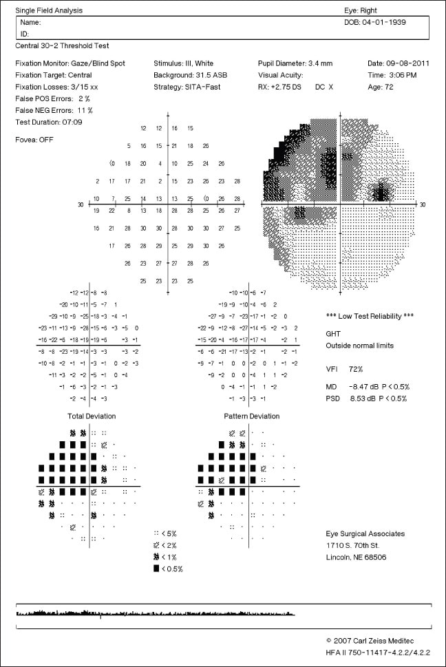 Figure 2. Formal visual field testing revealed a dense superotemporal scotoma corresponding to the area of the retina affected by the artery occlusion.