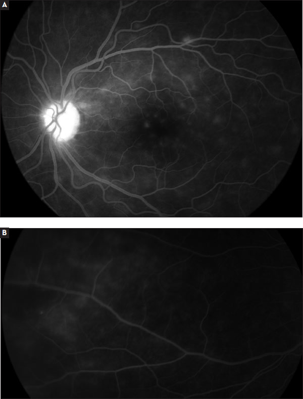 Figure 1. Late phase fluorescein angiographic images of posterior pole (A) and midperiphery (B) in a sarcoidosis patient with active retinal phlebitis.