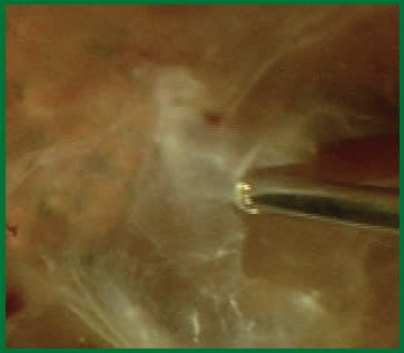 The ability to modify duty cycle to control flow, independent of vacuum and cut rate, allows us to use the vitrectomy probe slowly to shave tissue without it jumping into the probe. Thick blood clots are removed quickly, and membranes can be peeled from blood vessels. The ability to manipulate cuts per minute and duty cycle also expands the utility of the vitrectomy probe. Many tasks that we would have performed with other instruments in the past can be performed with just the probe. We can get under membranes to lift and dissect them. We can use the probe as forceps, scissors or a pick (Figures 2 and 3).