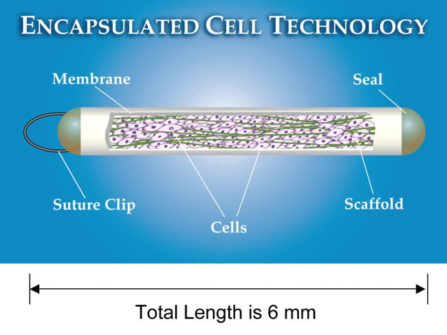 Neurotech USA developed encapsulated cell technology (ECT), a strategy to allow sustained, targeted delivery of CNTF into the vitreous, with direct access to the retina on a long-term basis. The NT-501 en capsulated cell implant ntains immortalized RPE cells that have been engineered to release CNTF at a continuous rate for periods up to 18 months (Figure 1a).22 The RPE cells are contained within a semipermeable membrane, with 15-nm pores that provide access to oxygen and nutrients such as glucose but that protect the RPE cells from interaction with the host's immunesystem (Figure 1b).28