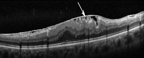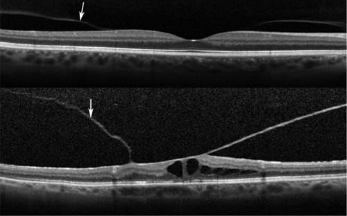 Bottom image shows posterior hyaloid (arrow) with distortion of foveal contour with cystic changes and splitting of retina suggestive of vitreomacular traction.