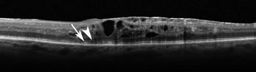 Top: SD-OCT scan of an eye with DME showing the presence of epiretinal membrane with retinal edema. Inner segment/outer segment junction (arrow) and ELM (arrowhead) are intact in central 1000 microns, ie, 0% disruption.