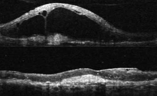 Figure 9. Top: SD-OCT scan shows cystic retina with vitreomacular traction with underlying choroidal neovascularization complex. Patient underwent vitrectomy with removal of the traction. Monthly intravitreal bevacizumab was continued.