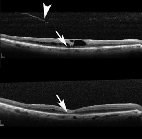 Figure 6. Preoperative (top) and postoperative (bottom) serial progression SD-OCT scans at the same anatomical site. Patient presented with best corrected visual acuity of 20/60 with posterior hyaloid (arrow-head) causing traction, epiretinal membrane and outer retinal damage (arrow) on SD-OCT scan (top). Patient underwent vitrectomy with ERM removal and recovered visual acuity improved to 20/50.