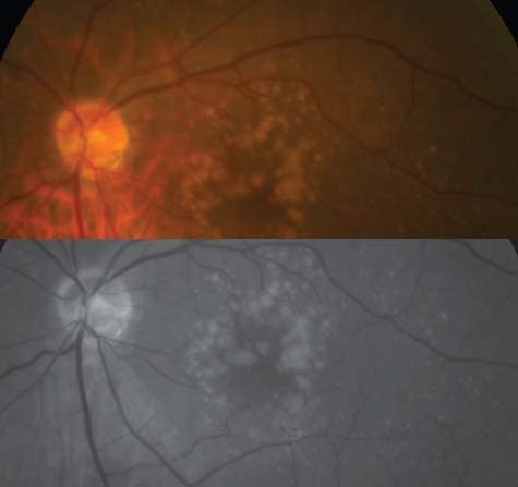 Above are color (top) and red-free (bottom) photographs of the retina of a patient with high risk dry AMD. Many retina specialists believe enough evidence has accumulated to justify using AREDS2 supplements in such a case.