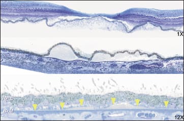 “So, what does all of this mean?” Dr. Curcio said by way of presenting the overall model of her presentation, ie, that lipoprotein particles form an “oil spill” in Bruch's membrane (Figure 16), which Dr. Curcio said was “just like an oil spill on the surface of sea water.” She demonstrated that these particles that appear to be vesicles on conventional post-fixation are actually solid particles when examined by quick-freeze deep etching. As age increases and lesions form, there is a fusion and pooling of lipids.