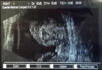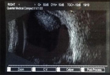 The patient called and was examined two days later due to intractable nausea and vomiting. His vision at this visit was barely light perception. The IOP in the right eye was 37 mm Hg by applanation. The choroidal hemorrhages were worse on examination and on ultrasonography (Figure 2). The anterior chamber was shallowing as well.