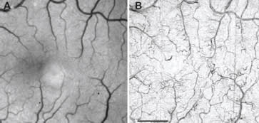 Figure 2. Invisible vasculature (in red-free images) revealed noninvasively by the RFI. A. Red-free image of a healthy subject. B. The RFI's capillary perfusion map, showing fine microvasculature detail (scale bar = 1 mm).