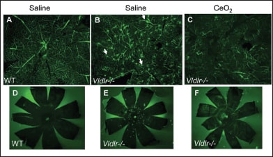 Figure 3. Nanoceria inhibit the development of pathologic intra- and subretinal vascular lesions in the Vldlr-/- retina. Photomicrographs of whole mount retinas (A-C) and eye cups (RPE, choroid, and sclera) (D-F) from P28 animals are shown. All retinal blood vessels were labeled green by the vascular filling assay. Wild-type (WT) retinas (A) showed the normal, weblike retinal vasculature, whereas those from the Vldlr-/- mice (B) showed numerous intraretinal vascular lesions or “blebs” (IRN blebs). See white arrows for exam ples. A single injection of nanoceria at P7 inhibited (C) the appearance of these lesions. Eye cups from WT mice (D) showed no subretinal neovascular (SRN) “tufts,” but those from Vldlr-/- mice (E) had many bright SRN tufts. A single injection of nanoceria on P7 inhibited the appearance of these SRN tufts (F). Reproduced from Zhou et al.28 with permission.