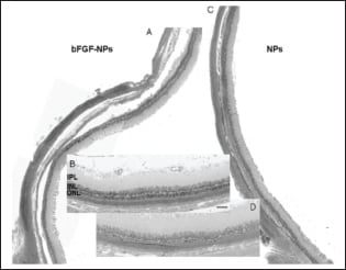 Figure 1. Morphologic rescue of the superior retina of RCS rats. Representative photographs eight weeks after injection with bFGF-nanoparticles (NPs) (A, B) and blank NPs (C, D). Note the preservation of the outer nuclear layer (ONL) in the bFGF-NP–treated retina, compared with the blank NP-treated retina. Higher magnification showed the respective differences better. Original magnification, x100. Scale bar, 50 ∞m. Reproduced with permission from Sakai et al.19