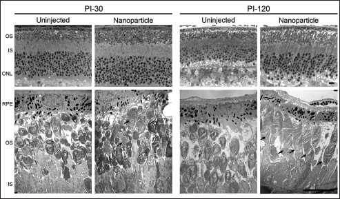 Figure 5. Transferred normal mouse peripherin (NMP) leads to structural rescue of the rds+/- phenotype. Light micro graphs (top row) and electron micrographs (bottom row, n = 3–5/group) from the temporal side of rds+/- eyes were examined. After postnatal day-5 injection, moderate ultra structural rescue is detected in the outer segments (OSs) of nanoparticleinjected eyes (arrows) at post-injection day-30 (PI-30); significant ultrastructural improvement in OSs of nanoparticle-injected eyes is apparent by PI-120. OS discs are properly aligned and flattened, and improved OSs do not exhibit the swirl-like structures typical of the rds+/-. IS, inner segment layer; RPE, retinal pigment epithelium. Scale bars = 10 ∞·m. Reproduced with permission from Cai et al.41