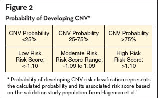 Individuals are stratified into one of three risk categories: low, moderate or high risk for CNV development (Figure 2). Those in the low-risk group have less than a 25% chance of CNV development, with the risk being 25% to 75% in the moderate-risk group and greater than 75% in the high-risk group. In patients with a diagnosis of AMD, individuals with a private insurer are currently guaranteed by Sequenom to have a maximum out-of-pocket expense of $150.