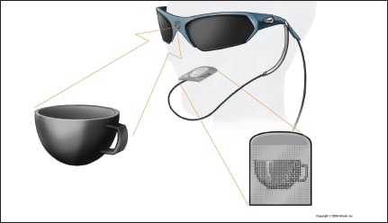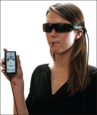The BrainPort vision system consists of a postage-stamp–sized array of 400 electrodes placed on the top surface of the tongue (Figure 2), a digital video camera affixed to a pair of sunglasses and a hand-held controller for settings, such as zoom and control of the stimulation level. Visual information is collected from the user-adjustable head-mounted camera (field of view 3º to 73º) and is sent to the BrainPort handheld controller.