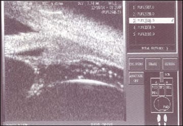 Initially, patients with retinal detachments alone (n=3) and patients with silicone oil with retinal detachments and clear media (n=2) were chosen for UBM evaluation. The UBM image patterns were studied in these cases, and consistently evident landmarks were identified with regard to the presumed ora serrata region. In addition, limitations of the imaging were also assessed.