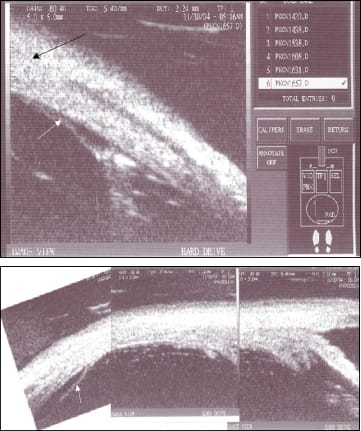 Figure 2. UBM image (top) of a silicone-filled eye showing the origin of a membrane (white arrow) at the termination of a hypoechoeic slit (black arrow) in a patient with opaque media due to cataracts. Note the point-like hyper-reflective echoes indicative of emulsified silicone oil globules. A UBM (bottom) montage shows the origin of a retinal detachment in an aphakic patient with anterior migration of silicone oil.