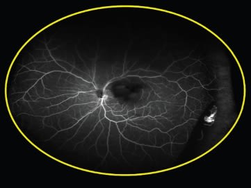 The second case Dr. Freund presented also used ultra widefield FA. This patient, a 55-year-old white woman, presented with what appeared to be posterior vitreous detachment–related symptoms, including the sudden onset of floaters related to a vitreous hemorrhage (Figure 1). The ultra widefield FA revealed instead that the problem arose from neovascularization related to peripheral nonperfusion; the fellow eye showed the same problem (Figures 2 and 3).