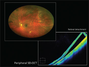 Next, Dr. Freund presented cases in which he used spectral-domain OCT and enhanced-depth imaging (EDI)-OCT. The first two were presented together, as they were cases in which wide-angle photography and FA suggested either peripheral retinal detachment or schisis. The cases were clarified with SD-OCT (Figures 5 and 6).